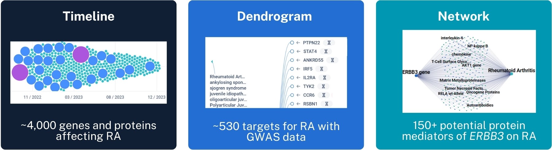 Using Icobber, almost 4,000 genes and proteins (supported by 23,000+ documents) have been associated with RA. To delve into those with genetic evidence, the results were prioritized by GWAS data, refining the search to around 530 genes and proteins, around 10% of which have been reported in 2023-2024. From the dendrogram view of results, protein-coding gene ERBB3 was among those with compelling evidence.